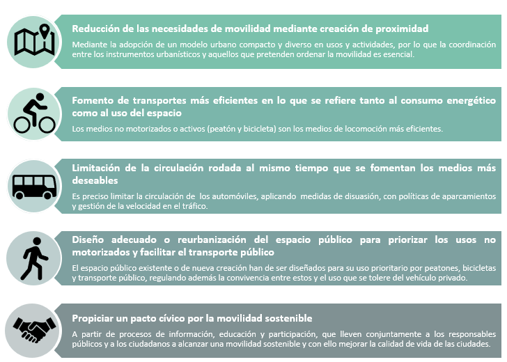 La movilidad sostenible se dota de una serie de principios rectores y de herramientas cuyos principios de acción de la movilidad sostenible pueden resumirse en los siguientes puntos: